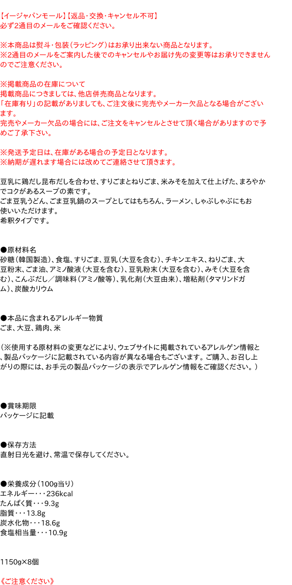 ●原材料名 砂糖(韓国製造)、食塩、すりごま、豆乳(大豆を含む)、チキンエキス、ねりごま、大豆粉末、ごま油、アミノ酸液(大豆を含む)、豆乳粉末(大豆を含む)、みそ(大豆を含む)、こんぶだし/調味料(アミノ酸等)、乳化剤(大豆由来)、増粘剤(タマリンドガム)、炭酸カリウム ●賞味期限 パッケージに記載 ●保存方法 直射日光を避け、常温で保存してください。